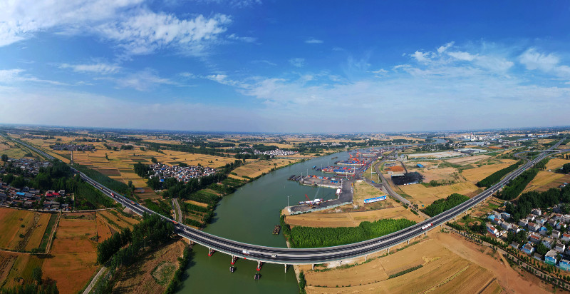 5月27日,周口港中心港区在碧水、蓝天、白云、金色麦浪、秀美村庄的映衬下,显得十分壮美。近年来,我市利用水陆交通优势,加快构建“铁公机水”多式联运体系,努力从“经济通道”迈向“通道经济”。记者 梁照曾 摄